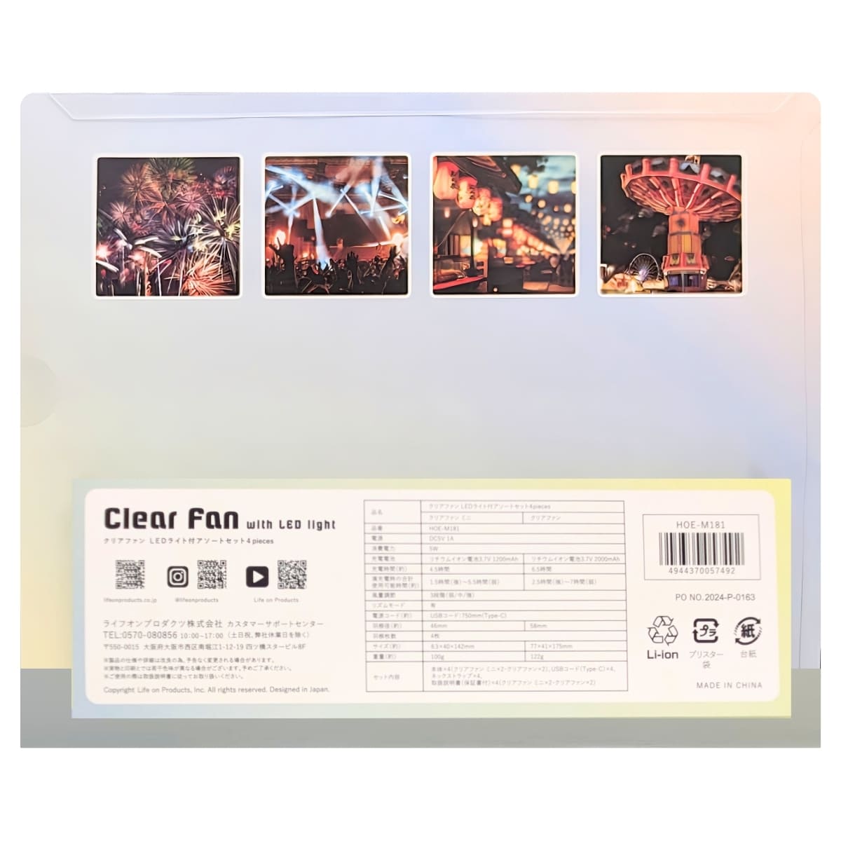 Life on Products クリアファン LEDライト付 アソートセット 4個入り HOE-M181 ミニ:2個 ファン:2個 電源:DC5V1A 消費電力:5W 風量調節:3段階 リズムモード有 クリアファン電源コード:UBS type-C 内容( 本体4本、USBコード4本、ネックストラップ4本、説明書4枚 )